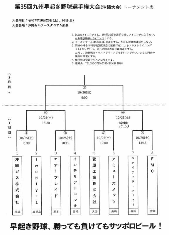 平素より弊社野球部への温かいご声援を賜り、誠にありがとうございます。このたび、「第35回 九州早起き野球選手権 沖縄大会」の組み合わせが決定いたしましたので、お知らせいたします。